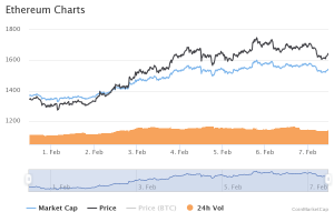 در این بین کوین تلگراف، در خصوص دلایل افزایش قیمت اتریوم می نویسد: اتریوم در دوم فوریه از مرز روانی 1500 دلار عبور کرد و بالای آن قیمت باقی ماند و اکنون در محدود 1700 دلار معامله می شود.
