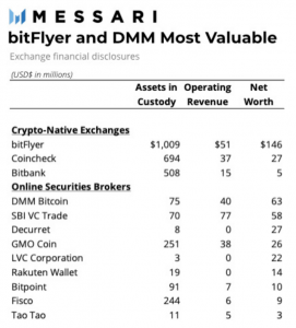 مساری 26 مجوز منتشر شده برای صرافی های ارز دیجیتال از زمان رگولاتوری شدن در آوریل 2017 را مشخص کرد. بر اساس این تحقیق تا ماه آگوست 2020 «بیت فلایر» با بیش از یک میلیارد دلار ذخیره دارایی و ارزش خالص 146 میلیون دلار بزرگترین صرافی ژاپن است.