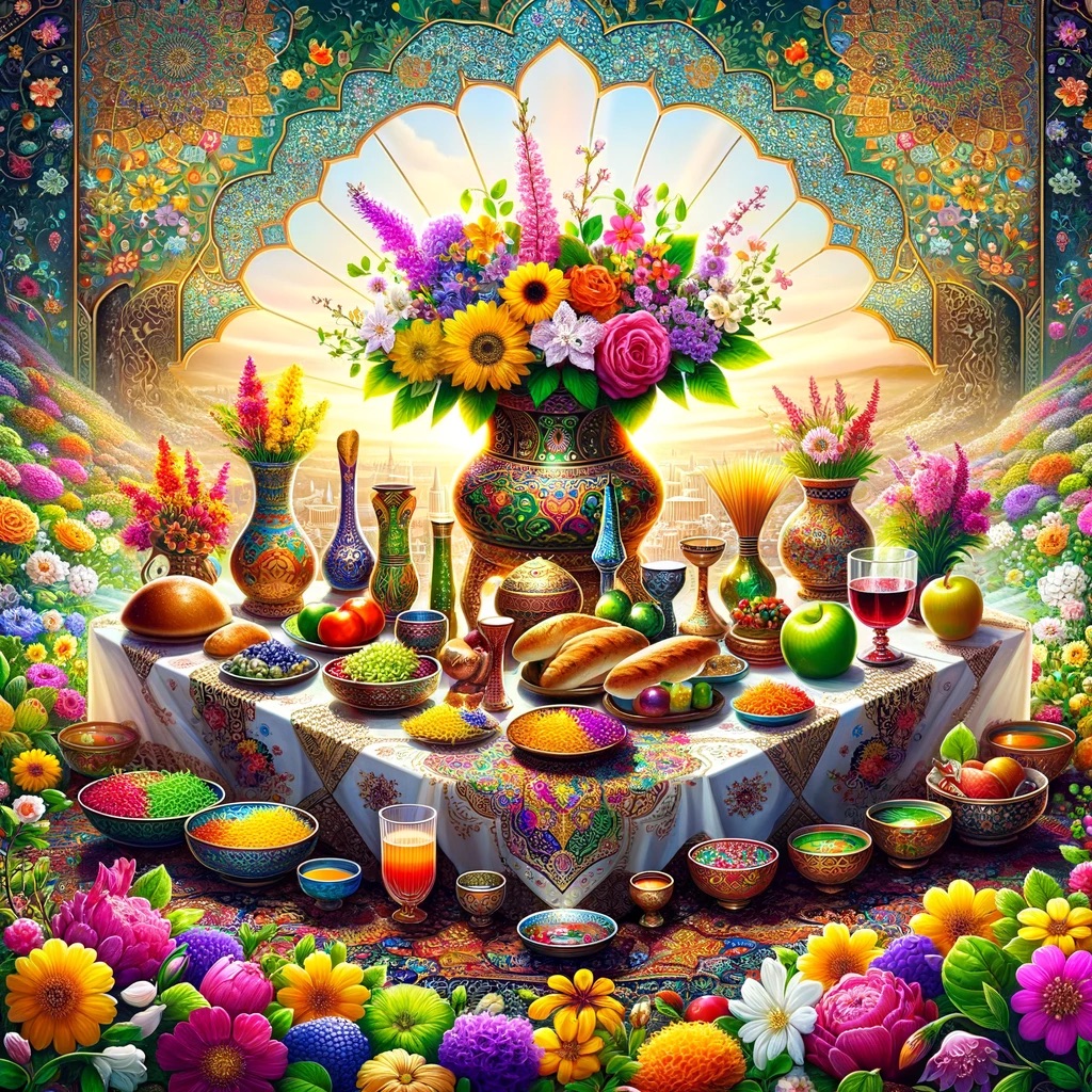 جشن پر جنب و جوش نوروز: تصویری که سفره هفت سین سنتی مزین به هفت آیتم نمادین آن را به نمایش می گذارد که در پس زمینه ای از گل های بهاری چیده شده است تا غنای فرهنگ ایرانی و مضامین جهانی تجدید و امید را نشان دهد.