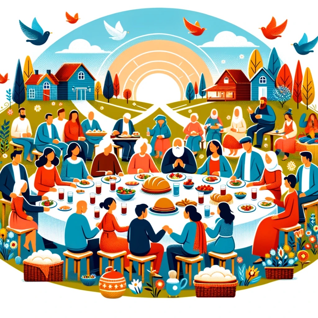 گردهمایی ها: تصویری که یک گردهمایی جشن را به تصویر می کشد، که در آن افراد با پیشینه های مختلف گرد هم می آیند تا یک وعده غذایی را در کنار یکدیگدر میل کنند و فرا رسیدن بهار را جشن بگیرند و بر اهمیت اجتماع و شادی مشترک تأکید کنند.