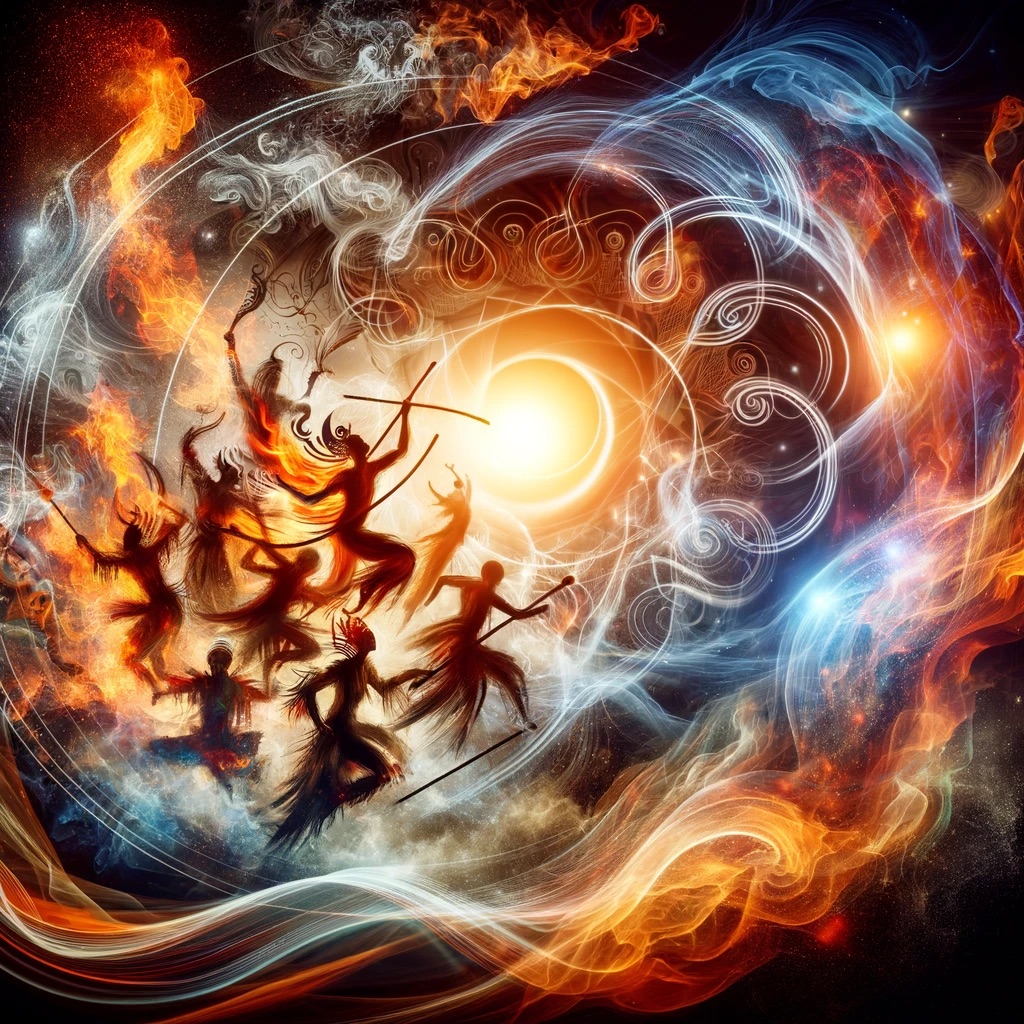 رقص تجدید: تصویری پویا که روح رقصها و جشنهای سنتی را با شعلههای آتش و موسیقی به تصویر میکشد که نمادی از ارتباط انسان با چرخههای طبیعت و انرژی پر جنب و جوش تجدید است.