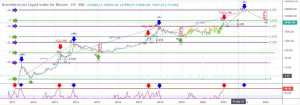 آنچه در چارت میبینیم در هر چرخه زمانی فلش آبی نمایشگر سقف و فلش سبز نشاندهنده کف سیکل بوده و تاکنون این توالی خاص دنبال شده است. سقف ها به ضرایب محدوده 0.272 1+ و کف آنها به 0.618 1+واکنش نشان داده اند.