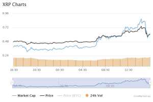 نمودار بالا نوسانات امروز قیمت XRP را نشان می دهد که در آن شاهد افزایش و کاهش شدید قیمت در یک ساعت مشخص هستیم.