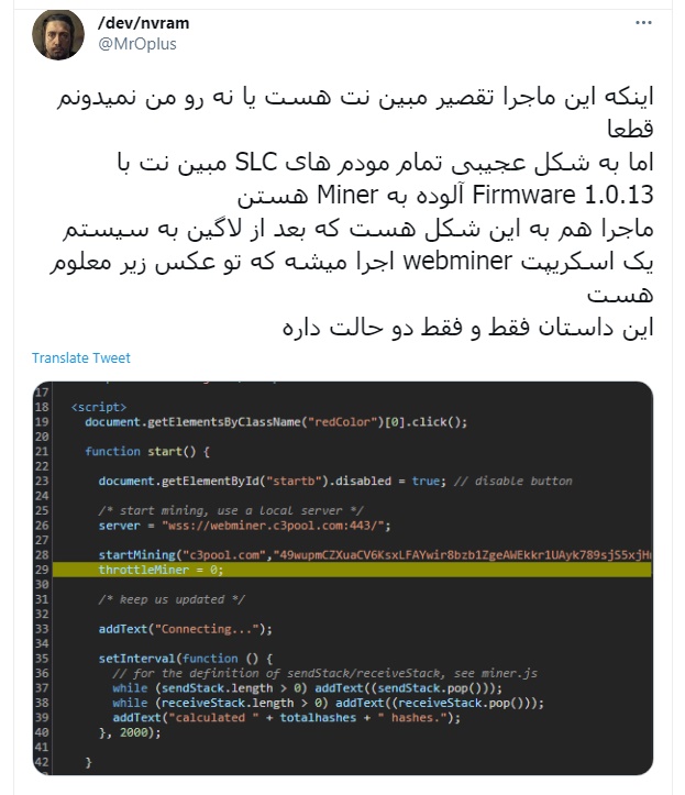 یک توسعه دهنده ایرانی در توییتر فاش کرد که مودم های SLC مبین نت آلوده به یک اسکریپت هستند که بدون اطلاع کاربر اقدام به استخراج بیت کوین می کند.