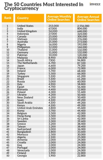 پس از آن، ویتنام هر ماه فقط 2،000 جستجو کمتر برای این شکل در حال ظهور ارز انجام می دهد. در این کشور در مجموع 23،000 جستجو در هر ماه به طور متوسط (276،000 هر سال) انجام می شود.