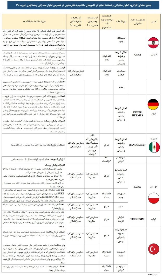 کشورهای عضو کارگروه اعتبار صادراتی و ضمانت اعتبار سازمان OECD، طی نظرسنجی که توسط این سازمان انجام شده، به معرفی اقداماتی که برای تسهیل صادرات و حمایت از صادرکنندگان پس از بروز بحران کووید-۱۹ انجام داده اند، پرداخته اند.