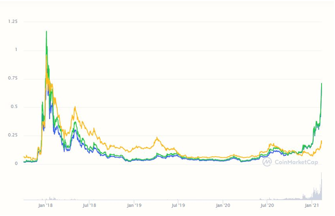 بالاترین قیمت ADA تا کنون، در اوایل سال ۲۰۱۸ بود که به ۱.۱۸ دلار رسیده بود. با وجود اینکه سرمایه خریداران در این برهه در حدود ۳۹۰۰ درصد رشد کرده بود، این رشد چندان پایدار نبود. پس از آن در مدتی طولانی روند قیمتی کاردانو نزولی باقی ماند و در پایان سال ۲۰۱۹ اندکی افزایش یافت. اخیرا و با رشد بازار ارزهای دیجیتال این رمزارز نیز روندی رو به رشد را در نمودار خود نشان میدهد.